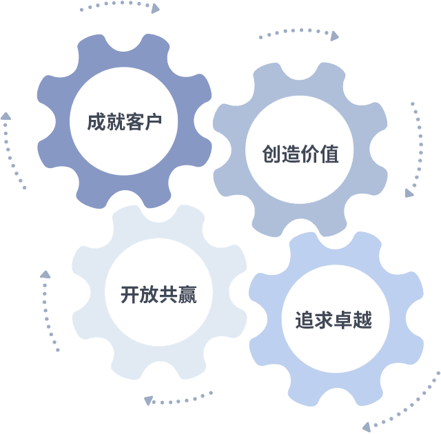 成就客户是一切决策的出发点,,,创造价值是衡量所有工作的标准,,,追求卓越是我们做事做人的态度,,,开放共赢是我们的格局也是最终的结果。。。。价值观的齿轮环环相扣,,,推动着组织里的每个人不断向前。。